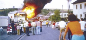 Scheune und Stall des Anwesens Winzenhörlein in der Würzburger Straße brennen nieder. Ein Übergreifen auf die Nachbargebäude und das Wohnhaus kann verhindert werden.