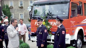 Kommandant Roland Schmitt zahlreiche Gäste begrüßen. Das neue Tagesleuchtrote LF 16/12 ist mit Automatikgetriebe und vielen technischen Teilen ausgerüstet. Das